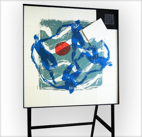 - 500 serigrafías numeradas y firmadas acompañadas de una carpeta que incluía una explicación de la obra, y que fueron ofrecidas a cada uno de los colaboradores en la clausura del acto.