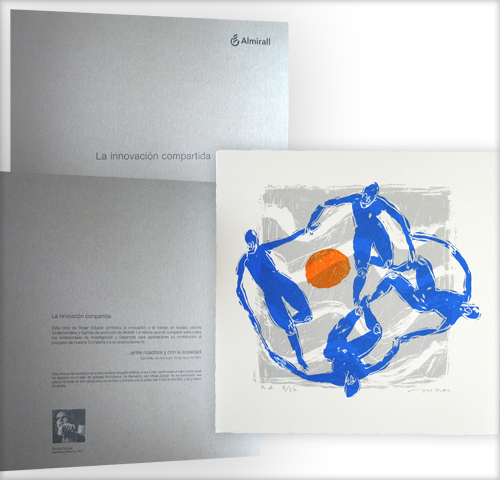 Con motivo de la inauguración del nuevo centro de I+D de Almirall, había que encontrar una idea de regalo y animación. Hemos hecho crear a la pintora Roser Oduber una obra que simboliza la innovación y el trabajo en equipo, declinada de la siguiente forma: