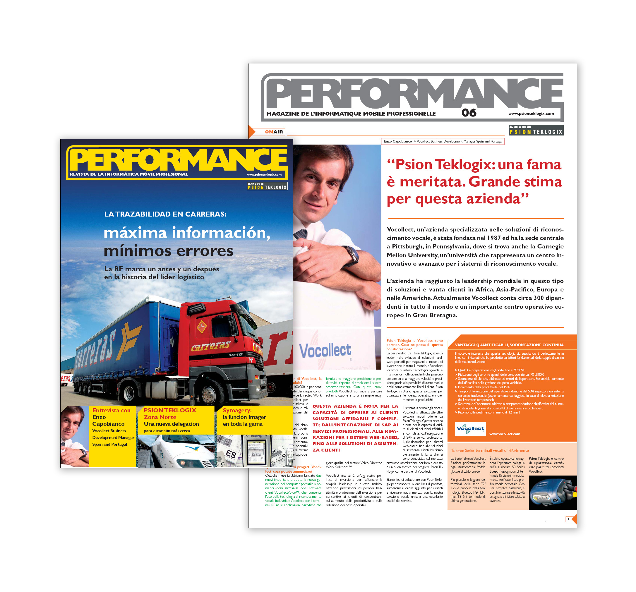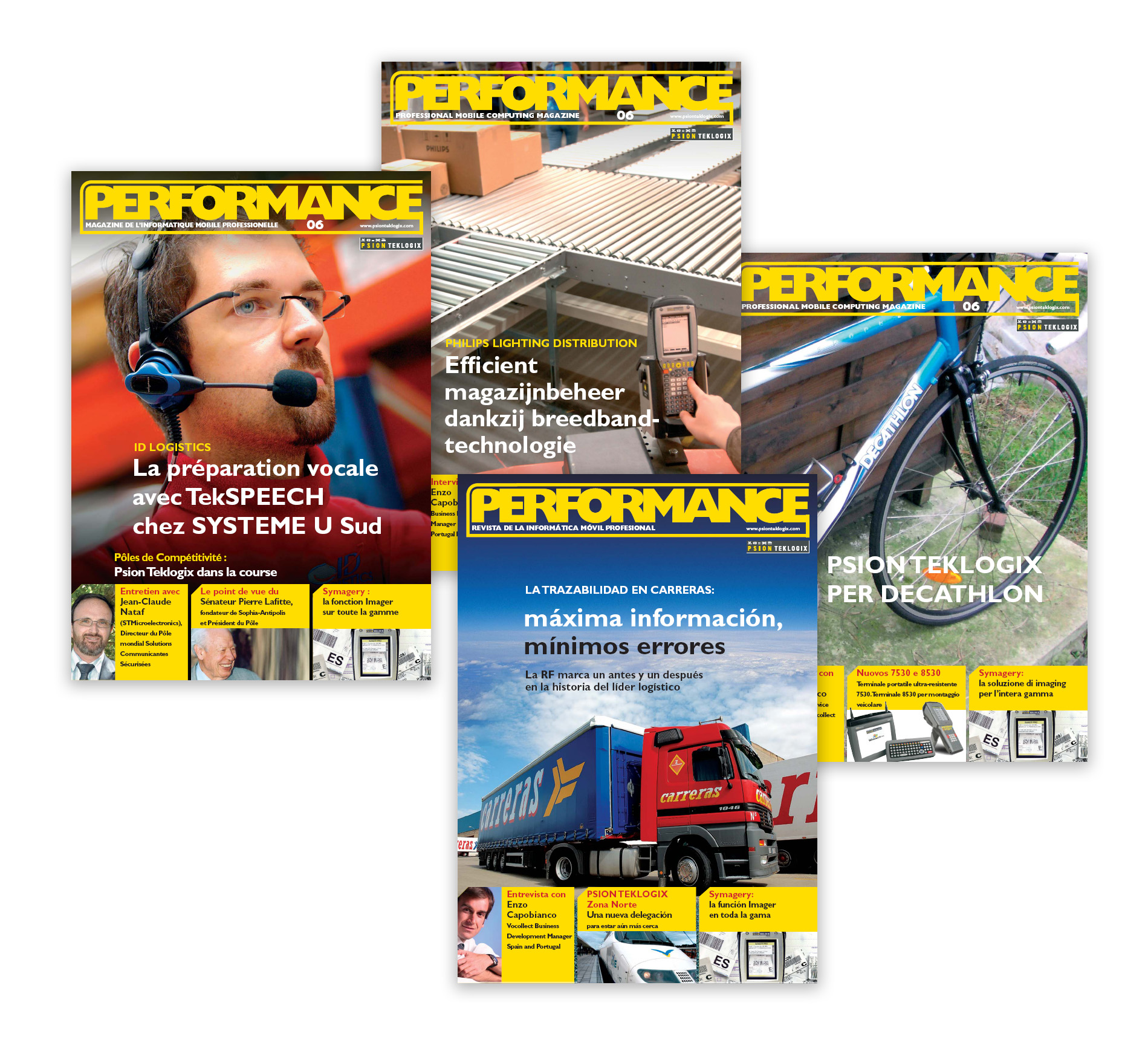 Durante 10 años, Psion Teklogix ha captado numerosos clientes en Francia gracias a su revista B-to-B, encartada en las mejores revistas del sector. De este éxito ha nacido Performance Magazine con 4 ediciones en 5 idiomas: Francia, España, Italia y Benelux (en francés y flamenco). Profusión de imágenes, tratamiento periodístico de los textos, casos prácticos de cada país en forma de reportajes, suscitan el interés de los lectores, más interesados en aplicaciones y soluciones que en especificaciones técnicas. La creación de una carta gráfica y redaccional única, la coordinación de un equipo de corresponsales, la puesta en común de artículos y la centralización de la creación gràfica y la maquetación agilizan su realización y generan una fructífera competencia entre las filiales.